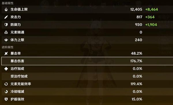 3、面板数据,生命值2W ,攻击力1181,防御力2834,暴击率48.2%,暴击伤害176.75