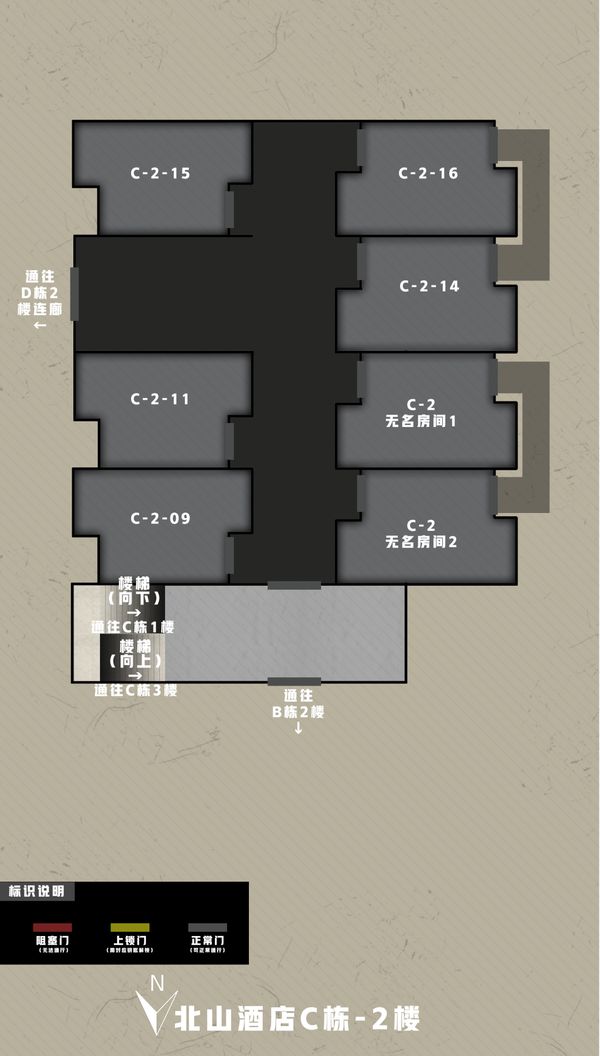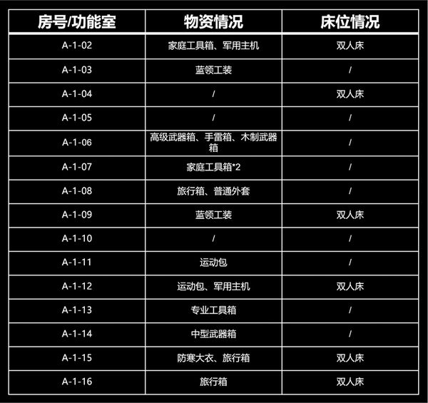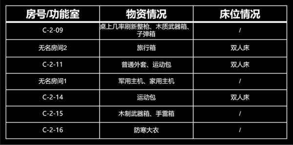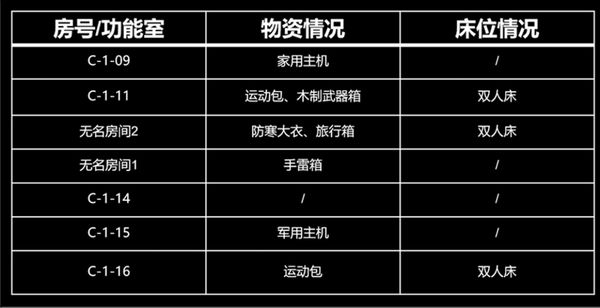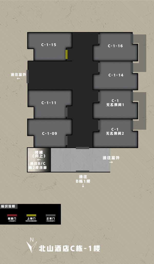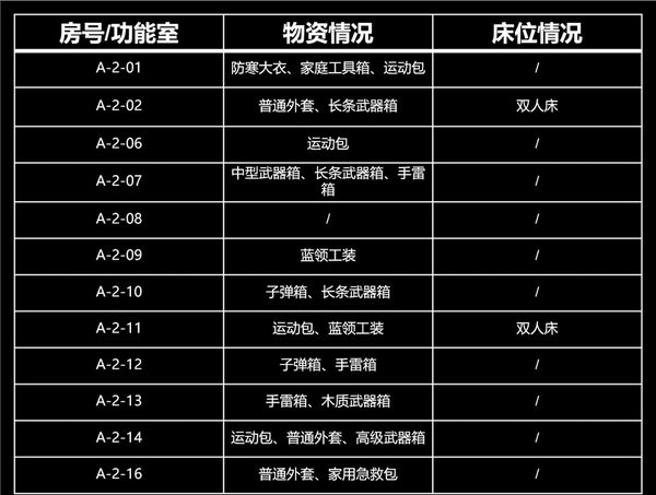 北山酒店A栋的资源相对少一些,没有保险箱。最重要的物资是A106和A214的高级武器箱,以及A115和A201的防寒大衣。虽然A栋的物资不算太多,但A栋却有着很好的架枪视野,在二楼南侧的房间允许架住B栋走廊;A、D栋之间的连廊,允许架住B、C栋之间的楼梯。不少联络人任务也是在A栋执行,因此熟悉A栋的构造还是很有必要的。