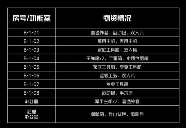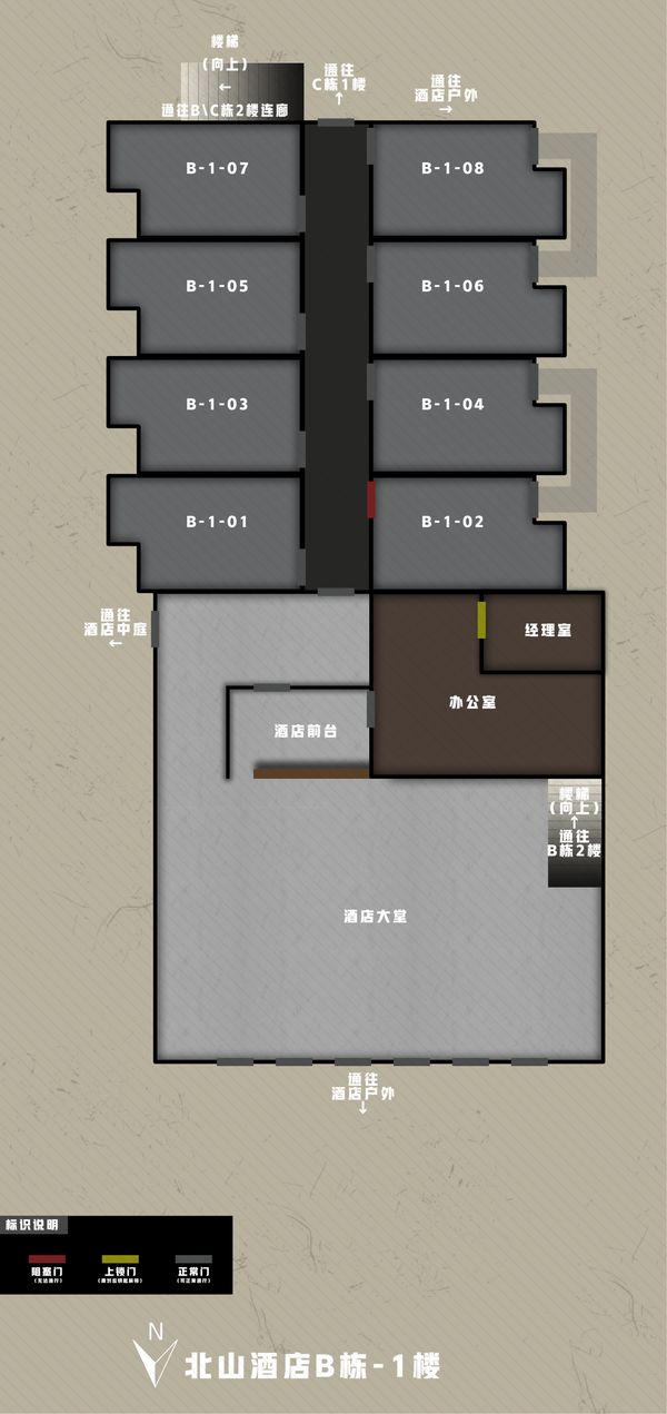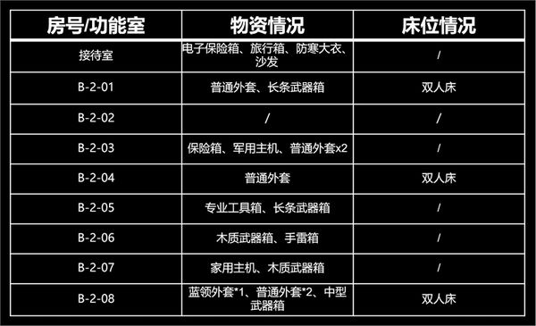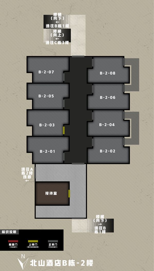 北山酒店B栋的资源较A栋更丰富一些,以工具箱、武器箱、外套为主,此外也包含少量军用主机和保险箱。在一楼办公室、B102共有三个军用主机可供搜索,其中B102需经由B104的阳台才可进入。一楼经理室、二楼接待室和B203等三个带锁房间各有一个保险箱(接待室是电子保险箱),先锋们记得提前带好相应的钥匙。