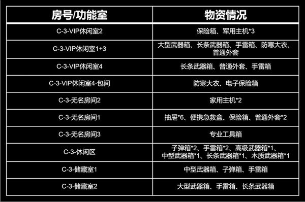 C栋是北山四栋建筑里唯一的三层建筑。C栋的1、2楼往往比较平静,但C栋三楼则物资非常丰富,有三个保险箱和多个武器箱,衣服、手雷箱、子弹箱数量也很可观,是先锋们的必争之地。三个保险箱还有一个不需要钥匙即可开启,建议达到C栋的先锋优先前往搜索。