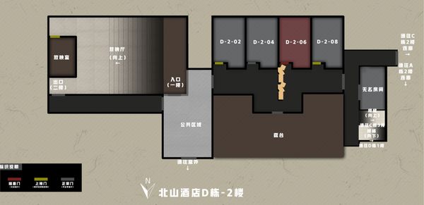 D栋内部结构较为轻松,横跨一二楼的放映厅占据了大量空间,因此房间数量较少。但需要钥匙的208房和放映室都有保险箱允许摸索,如果准备了钥匙,收益也是比较可观的。如果选择从A、D栋之间的破洞进入酒店,一般会选择把这两个房间的东西摸完后再通过D栋二楼西侧的楼梯向C栋三楼前进。