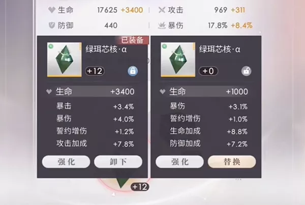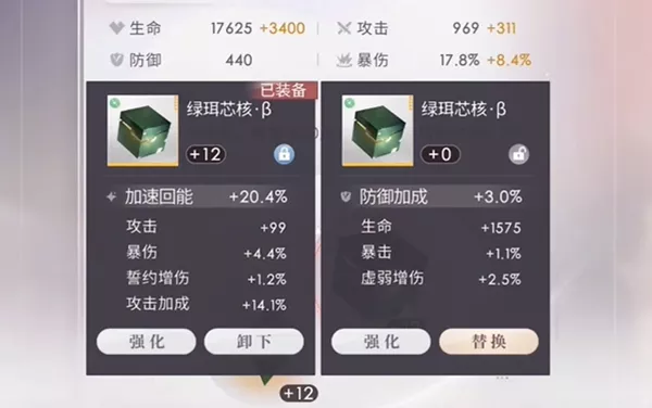 2、对于月卡和日卡左边的芯核,他们的主属性是固定的,因而不用看,直接从副属性的数值开始看。