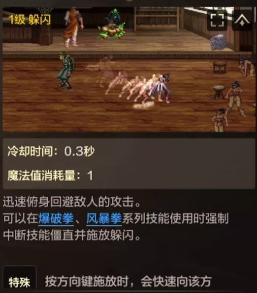 2、另一核心技能【躲闪】,使角色能够俯身躲避敌人攻击,正是这一技能让女蓝拳的动作显得轻盈飘逸。在按下技能键的同时操纵方向键,角色便会在指定方向进行闪避,并能柔化拳系技能的连贯性。