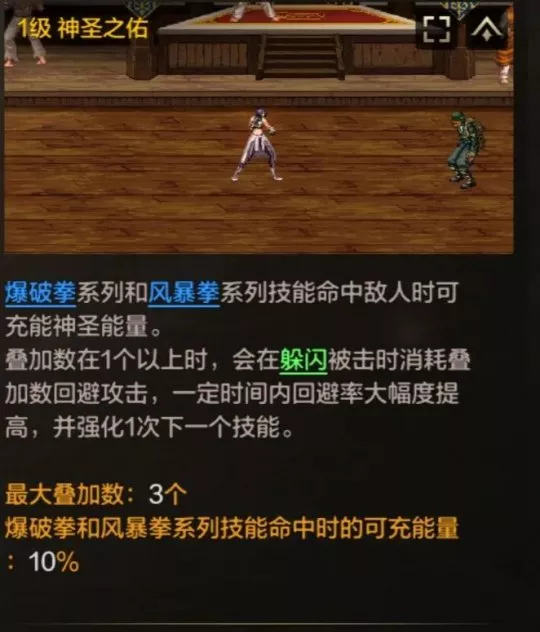 3、第三项核心技能是【神圣之佑】,通过拳系技能命中敌人积攒神圣能量。使用1点神圣能量可在激活【躲闪】时大幅提高回避率,并强化下一次技能的效果。【爆破拳】系的技能破招能够击破对手的霸体,而【风暴拳】系则有机会使敌人眩晕。