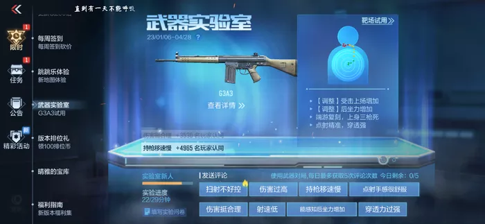 如你所见,武器实验室活动界面已经公示了G3A3的两项调整内容,分别是受击上扬增加和水平后坐力增加。通过和上个版本G3A3的对比可行发现,它的受击稳定性由0.2调整为0.5,水平后坐力由68调整为40,差异还是比较大的。