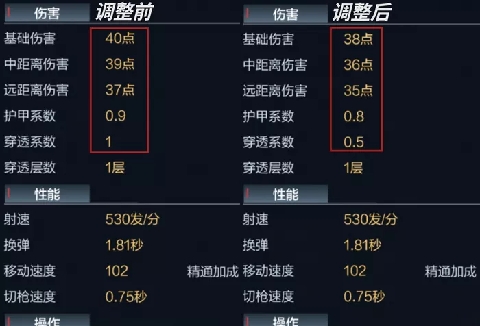 而且这还没完,除了已经公示的两项调整以外,还有好几项调整内容没有发出来,不过紧接着我会全部告诉大家。首先是伤害和护甲系数方面的调整,伤害由40降至38,护甲系数也由0.9降到达0.8。但是调整后的G3A3依然可行做到上半身3枪死,所以问题不大。
