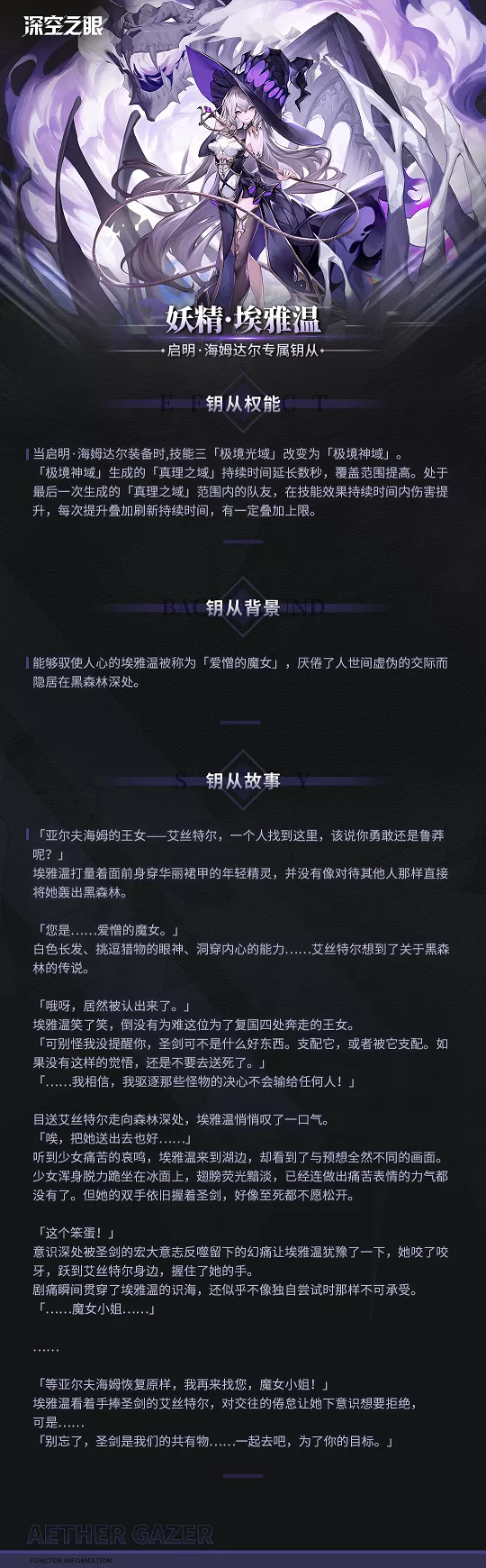 埃雅温,这位被世人称为爱憎的魔女,拥有洞穿内心的能力,却因厌倦人间虚伪的交际,而选取隐居在黑森林深处。她似乎与另一位妖精王女——艾丝特尔还有着不解的渊源。