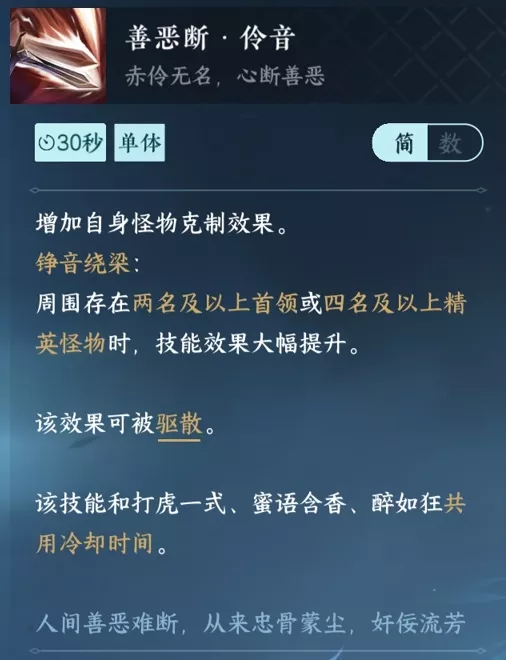 7、善恶断·伶音技能效果:在百家技能界面中,将善恶断替换为善恶断·伶音,提供4% 596点首领克制,持续24秒,冷却30秒。在多怪场景中效果提高25%。
