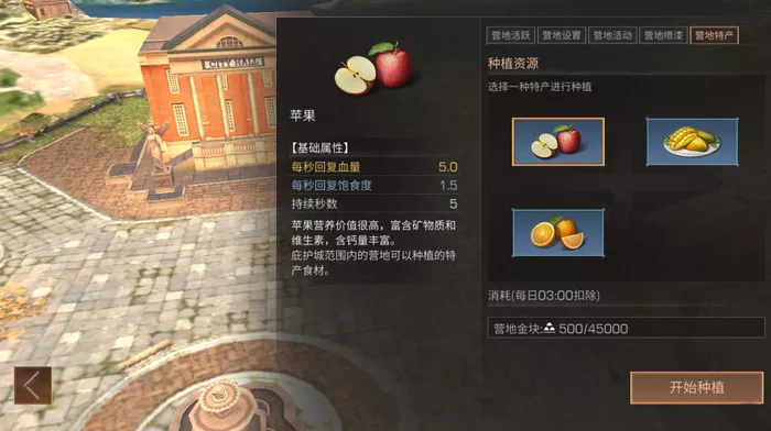 市长或代理市长可在市政厅沙盘-营地管理,消耗500金库金条选取种植特产的种类,特产的更换具有一天的冷却期,不相同的庇护城的特产不相同。