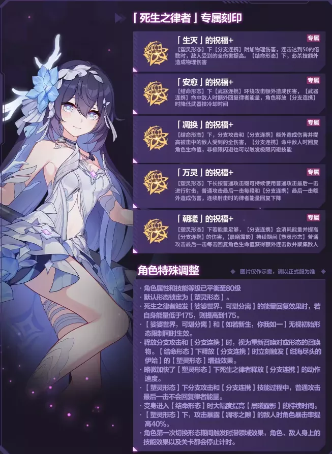 [塑灵形态]下[分支连携]附加物理伤害,连击到达50的倍数时,敌人受到的全伤害提高。[结命形态] 下,必杀技额外造成物理伤害