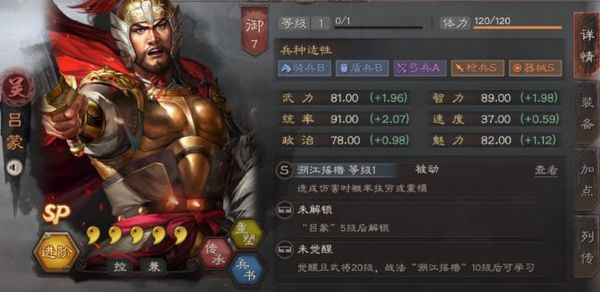 SP吕蒙的面板十分不错,除了速度外,都是80-90的初始值,以及2.0左右的成长,十分均衡,不论是做主将、辅助、输出,都是可以的。适性方面继承了普通吕蒙的适性,单就适性而言,SP吕蒙依旧是吴弓、吴枪的不二辅助。