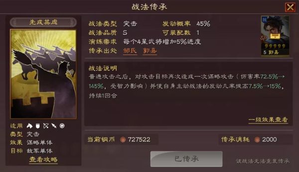 这个战法就极具功能性了,给主动战法加15%几率,根据描述看,并不限于自带战法,也可以是第3战法。特别适合带奇正相生的武将。