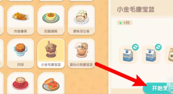 4、期间须要注意点击发生的勺子图标,烹饪结束后点击拾取菜品即可拿到小金毛康宝蓝。