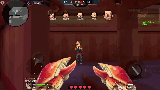 在该模式中原有的战斗方式也会有所改变,比如血量和武器方面。该模式不能够运用自己装备进背包的武器,只能够运用系统提供的武器。该武器为虾蟹的钳子,初始伤害并不高,攻击范围也较短,操作难度大。但随着击杀数的提高均会提高,而玩家的血量会提高为200,也就是说,想重击一击必杀的想法不再现实,可能轻击反而好用一些。