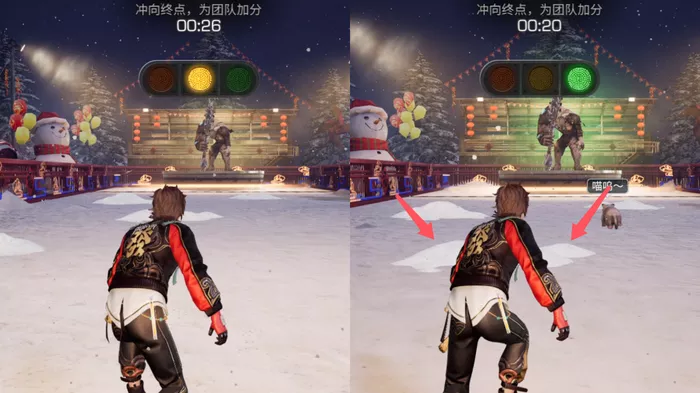 在黄灯亮起时,及时停下步伐,并注意观察周围环境,记得绕开触发减速效果的雪堆。