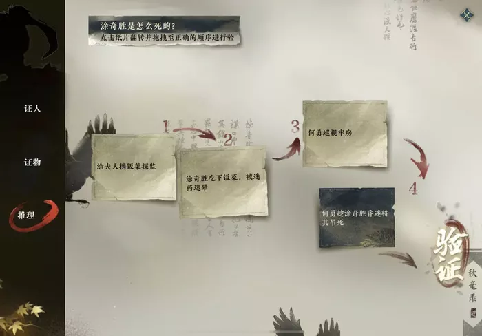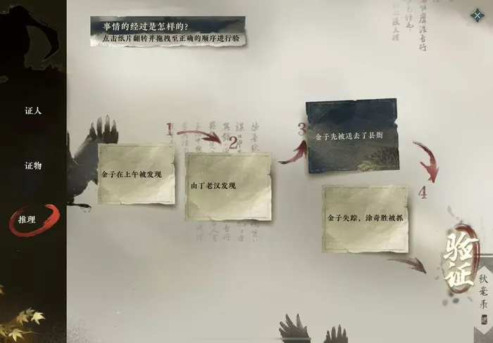 1、首先去磁州驿站听旁人说话,随即打开线索簿推理事情的经过。纸片点击可翻转,正确顺序如下: