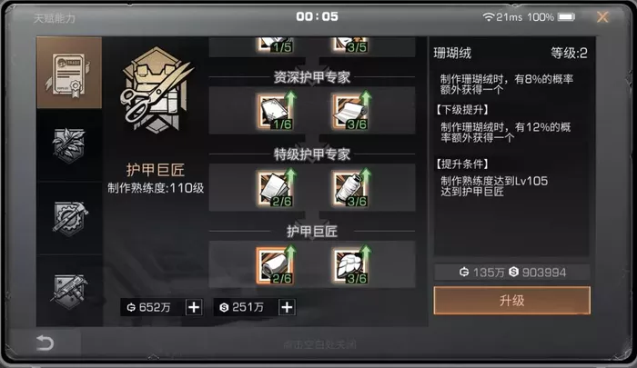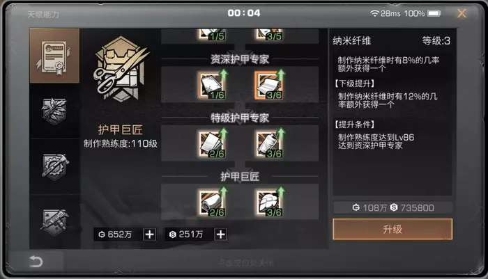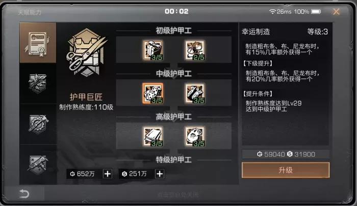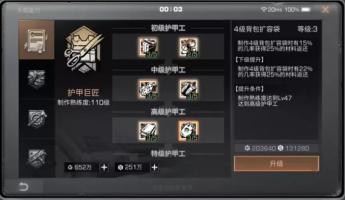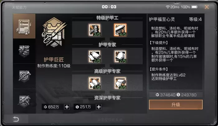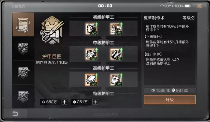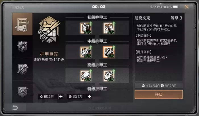 如果想要利用该护甲,建议点到二级。到达二级后制作朋克夹克时,有概率取得25%的材料返还。