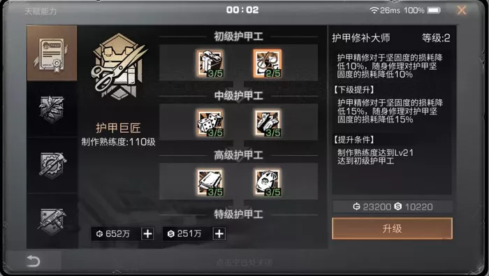 护甲修补大师可以降低护甲精修对于护甲坚固度的损耗。降低随身修理对于护甲坚固度的损耗、