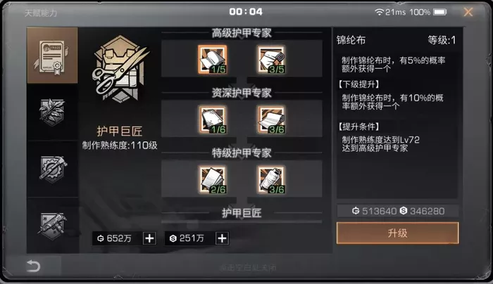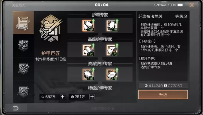 学习该技能后,在制作塑料、涤纶布、呢绒布时有概率额外取得几个,到达四级后可解锁职业专属半成品“玻璃钢”,因此推荐点到四级。