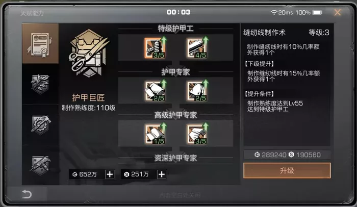 到达二级后制作缝纫线时有概率额外取得几个缝纫线,建议点到三级。