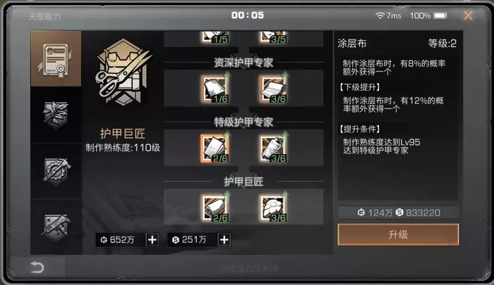 涂层布用于制作护甲、无人机结构,且为开放制作的半成品,因此该技能可点可不点。