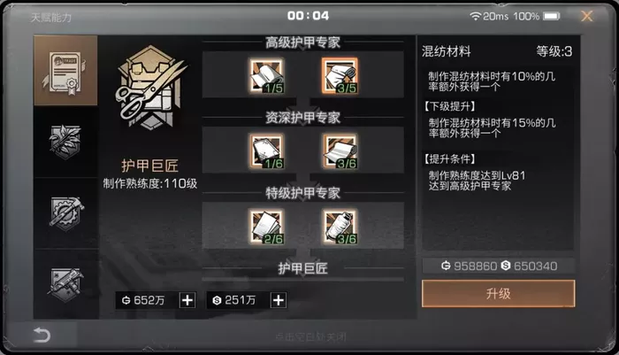 学习该技能后可解锁职业专属半成品“混纺材料”,该材料是众多核心道具制作的必需品,到达二级后在制作时有概率额外取得几个。建议点到三级。
