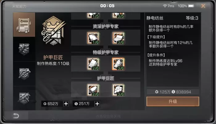 学习该技能后可解锁职业专属半成品“静电纺丝”,该材料是护甲、护盾、无人机结构制作的必需品。