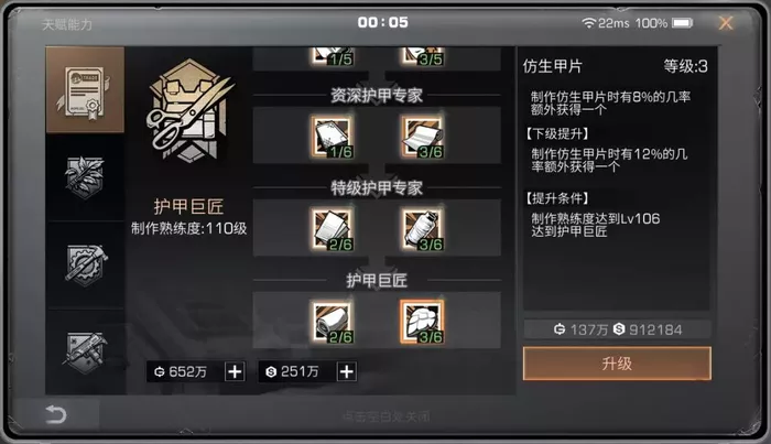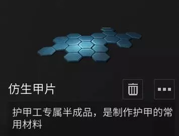 学习该技能后可解锁职业专属半成品“仿生甲片”,该材料是制作电磁机枪、狼袭战甲等的必需品,同时升级到二级后制作时有概率额外取得几个,建议点到三级。