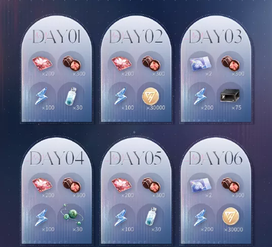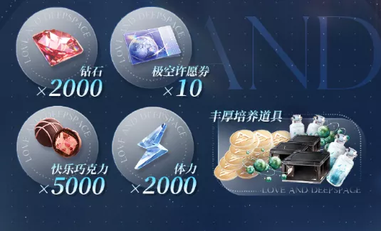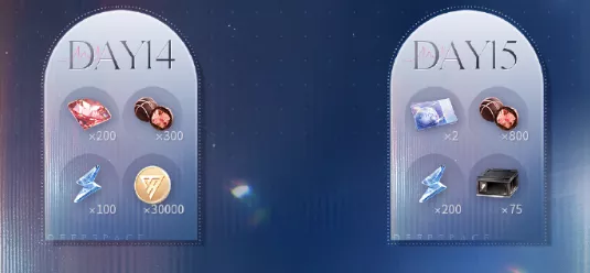 2、累计签到15天,共计可免费领取「钻石*2000、极空许愿券*10、快乐巧克力*5000、体力*2000」和丰厚培养道具奖励。