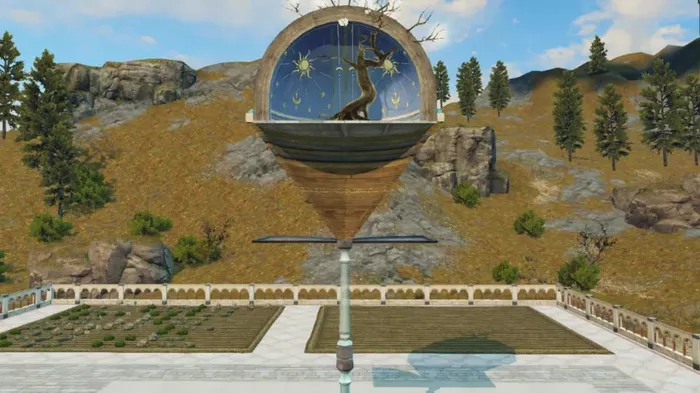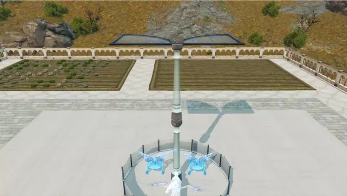 6、在柱顶放置船舷小圆角,继而铺上旧石质扇形地板,放置美美的黄金舞蹈树作为装饰,继而在石质地板上放置占星圆屋顶。