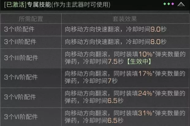 翻滚技能需要装备轻型武器配件后方能触发,不相同等级的武器配件触发翻滚技能的效果也有所不相同。