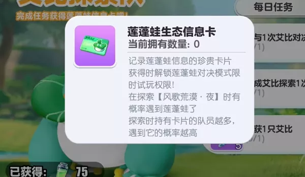 1、须要获取莲蓬蛙生态信息卡,与艾比对决一次即可获得。