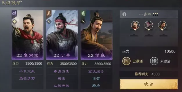 5级推荐土地守军建议选取“于禁丁奉沙摩柯”“文聘董袭刘晔”“皇甫嵩丁奉简雍”。