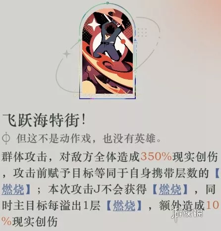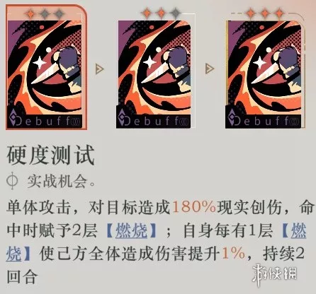 1、技能一·硬度测试:单体攻击,对目标造成270%现实创伤,命中时赋予2层[燃烧];自身每有1层[燃烧]使已方全体造成伤害提高1%,持续2回合。