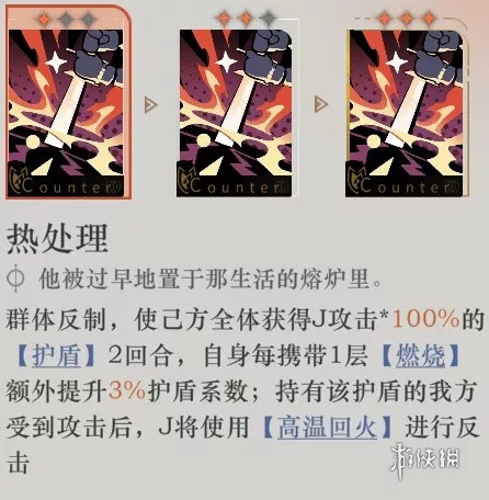 2、技能二·热处理:群体反制,使己方全体取得J攻击*100%的[护盾]2回合,自身每携带1层[燃烧]额外提高3%护盾系数;持有该护盾的我方受到攻击后,J将利用[高温回火]进行反击。
