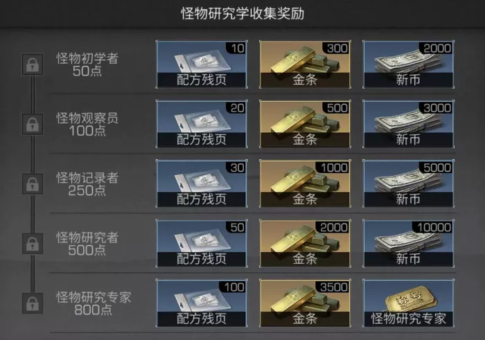 完成怪物研究学的所有收集共计可拿到配方残页*210、金条*7300、大量新币及怪物研究专家称号。