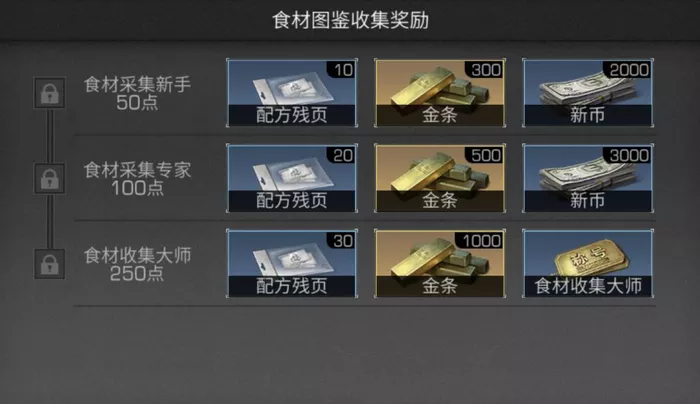 完成食材图鉴的所有收集共计可拿到配方残页*60、金条*1800、大量新币及食材收集大师称号。
