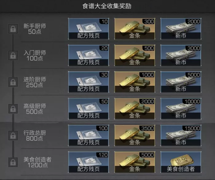 完成食谱大全的所有收集共计可拿到配方残页*330、金条*12300、大量新币及美食创造者称号。