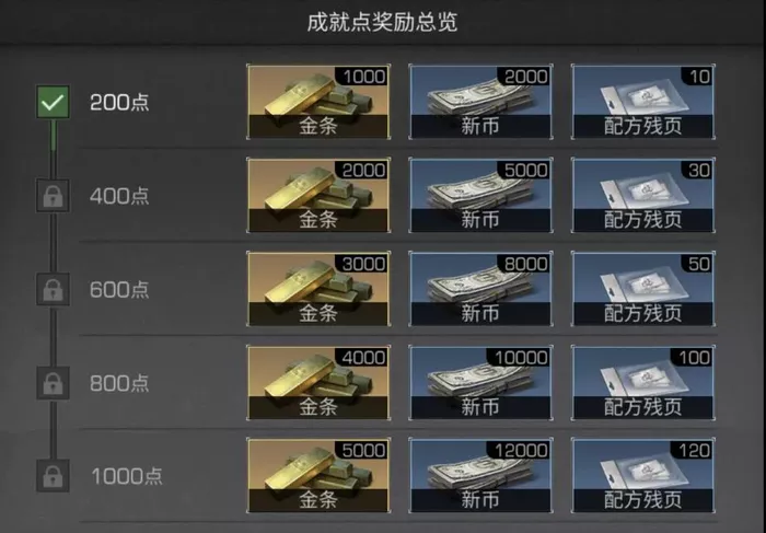 完成成就手册的所有任务共计可拿到金条*15000、配方残页*310及大量新币。