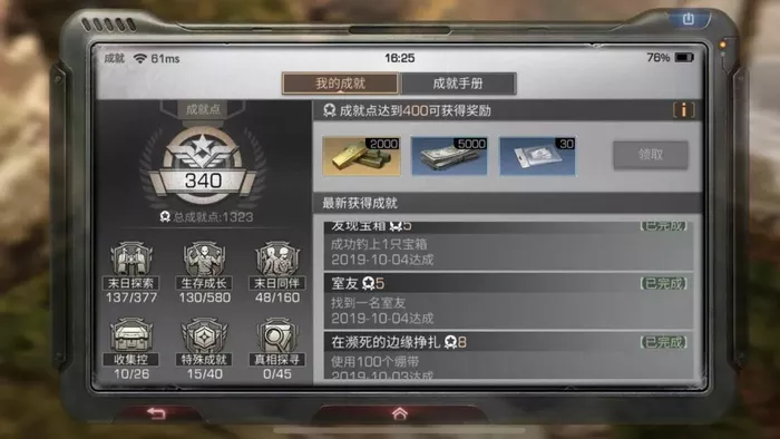 通过完成末日探索、生存成长、末日同伴、收集控、特殊成就、真相探索、重建行动的指定任务拿到相应成就点数。