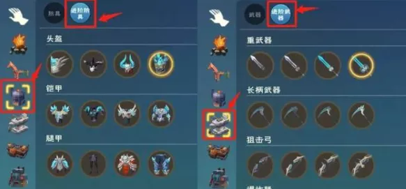 如下图所示,防具可在铸造炉-进阶防具处进行改造,武器可在铁砧-进阶武器处进行改造。