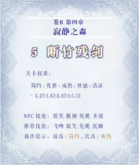关卡权重:简约:优雅:成熟:性感:清凉 = 3.27:1.67:2.67:1:1.13