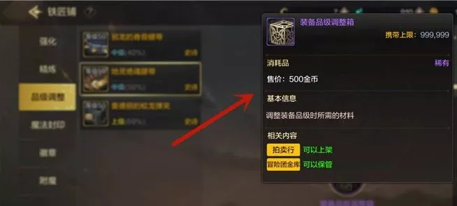 4、在调整品级前,须要自身有装备品级调整箱。