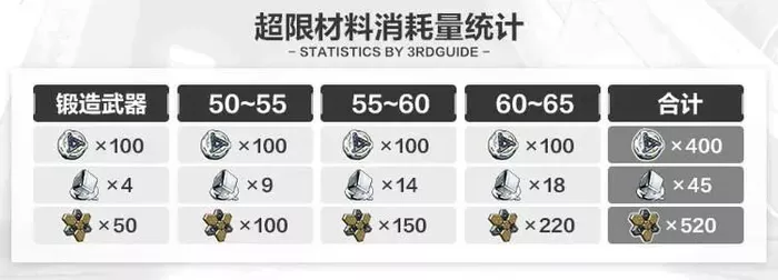 下图即为改动后,锻造超限武器并升满所需的材料量: