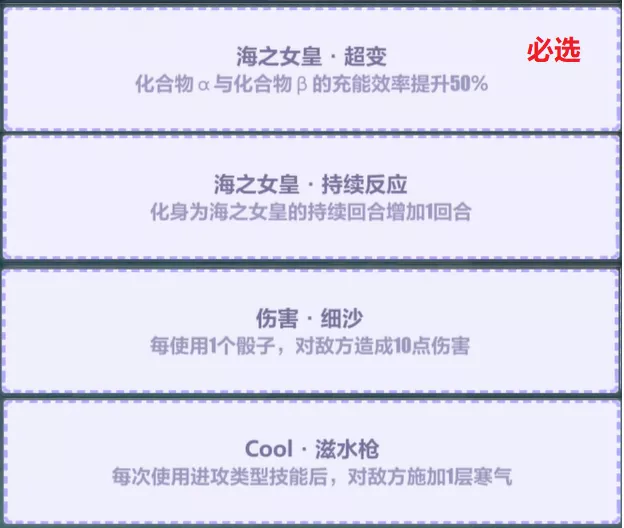 被动推荐:海之女皇·超变(必选)、海之女皇·持续反应(推荐)、滋水枪(推荐)、细沙(推荐);