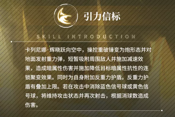 卡列尼娜辉晓重锤地面,对范围内敌人造成暗属性伤害,并施加降低目标暗属性抗性的连锁聚变效果。