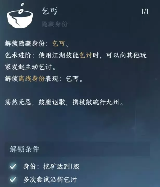 5、乞讨成功一次,在身份·挖矿达到一级后即可解锁乞丐身份。