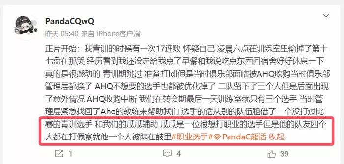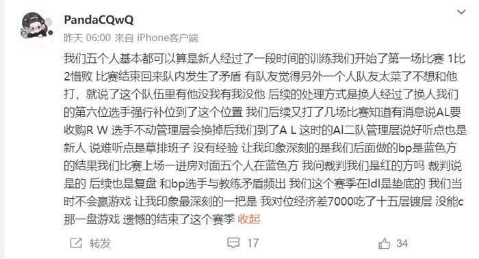 近日,PandaC在微博发长文回忆了自己的职业生涯,其中谈到了LDL的黑暗内幕:前队友辅助瓜瓜是一位很想打职业的选手,但是他的队友四个人都在打假赛,就他一个人被瞒在鼓里!