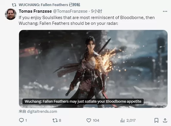 日前,外媒digitaltrends发布了国产类魂《明末:渊虚之羽》的试玩报告,作者表示“如果你喜欢《血源》风格的类魂游戏,那即将推出的《明末:渊虚之羽》绝对值得关注。”,《明末》官推也转发了这篇文章。
