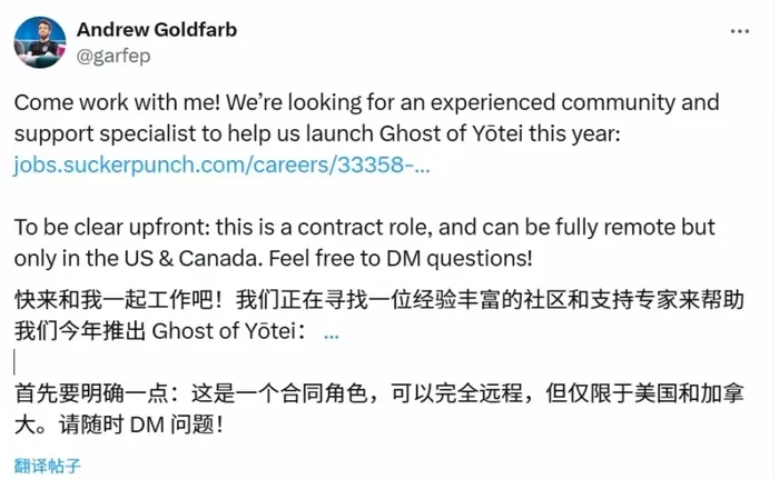 今日,SuckerPunch Productions公司高级传播经理Andrew Goldfarb在网络上发布了一则招聘信息,寻求资深社区与支持专员,以帮助今年推出的《羊蹄山之魂》。